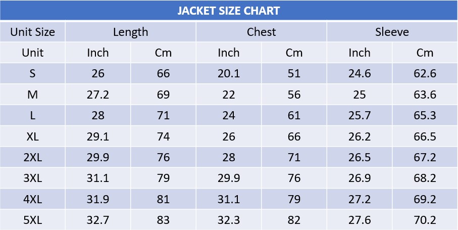 | Jacket Size | S, M, L, XL, 2XL, 3XL, 4XL, 5XL |